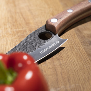This a great product, the design is very ergonimic, a good knife in your hand feels strong and robust. It promotes good grip and rests in your palm securely. It is light enough to cut the vegetables and heavy enough for meat. It has a good weight. Craftmaship and design is superb very much recomended.